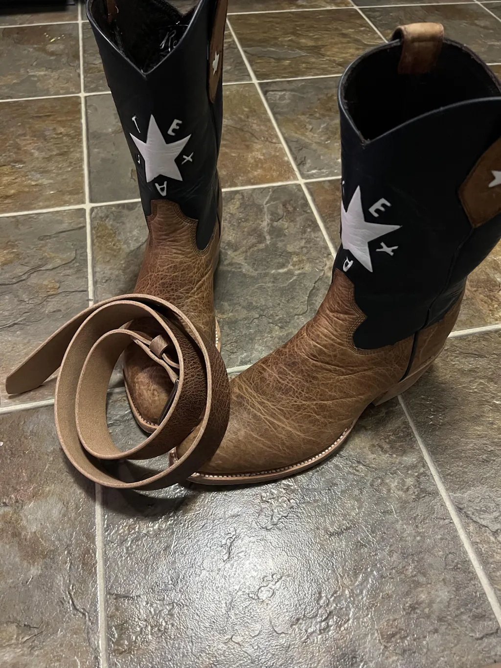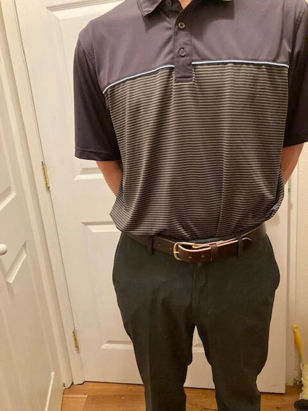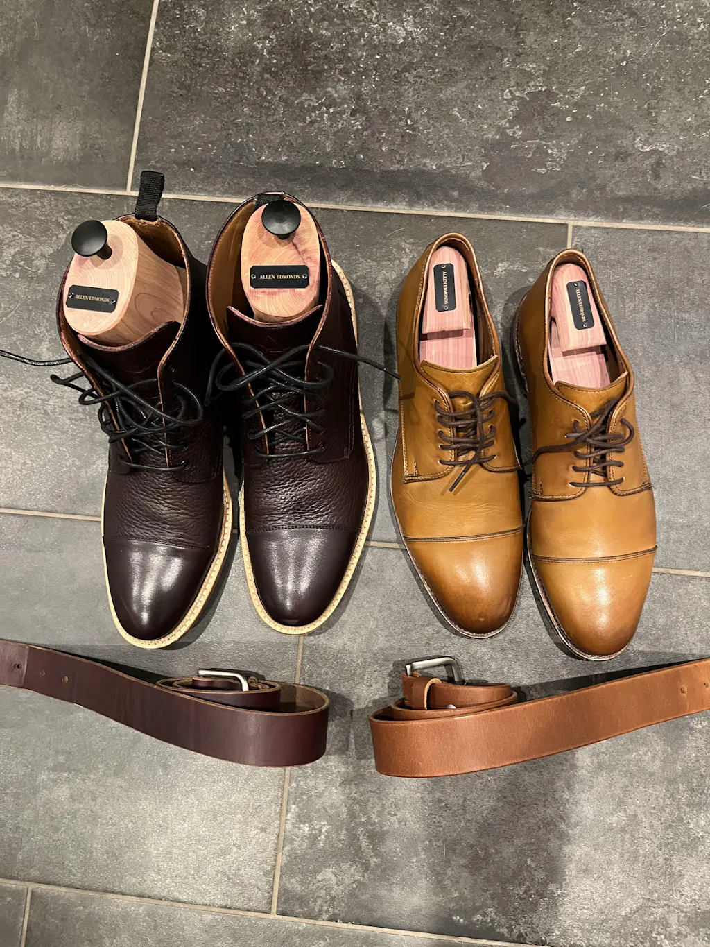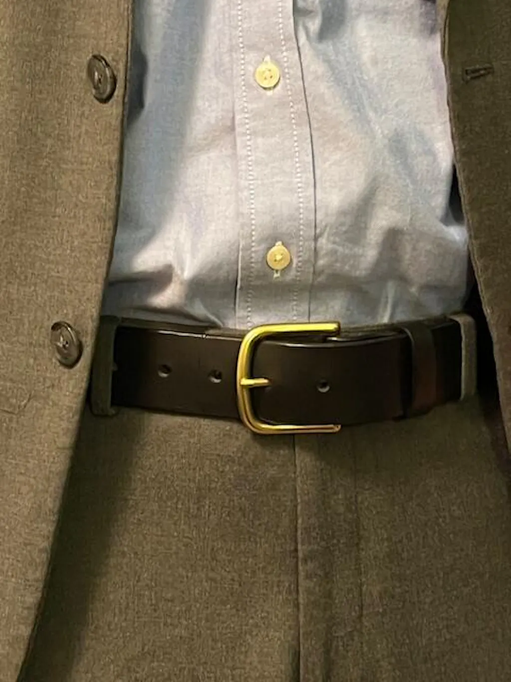 Bought two belts - the burgundy horween leather belt and the golden brown leather belt. The burgundy pairs really well with darker burgundy/oxblood color boots and the golden brown goes well with walnut colored park ave Allen Edmonds. Width was 1 3/8” making it versatile enough for dress pants and jeans. Great communication with the seller. Great fit. Will definitely be recommending to others in search of a belt