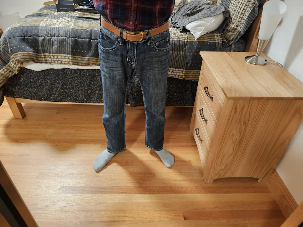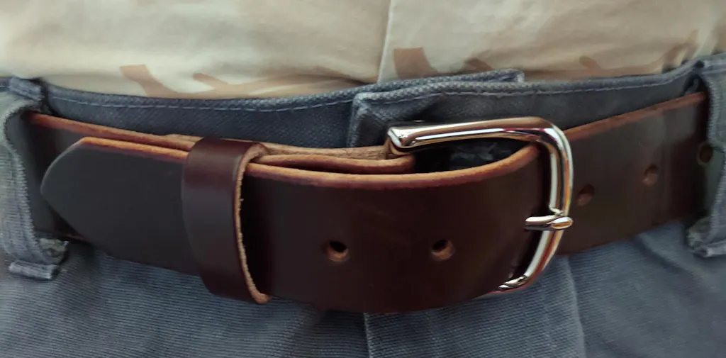 This is one tough yet beautiful belt. I wore it with dress slack and dress jeans on a business trip for one full week before taking this picture of it on with an old pair of work pants. I love everything about it. I ordered the Thick Hermann Oak which is exactly what a big guy like me needs. Additionally, if anyone follows the instructions for Method #1 sizing, their belt will come delivered to the perfect size. I really appreciated those instructions. The belt fit perfectly, and Matte Black w/ Roller Bar is exactly what I need. I will be coming back for more and definitely recommending to others.