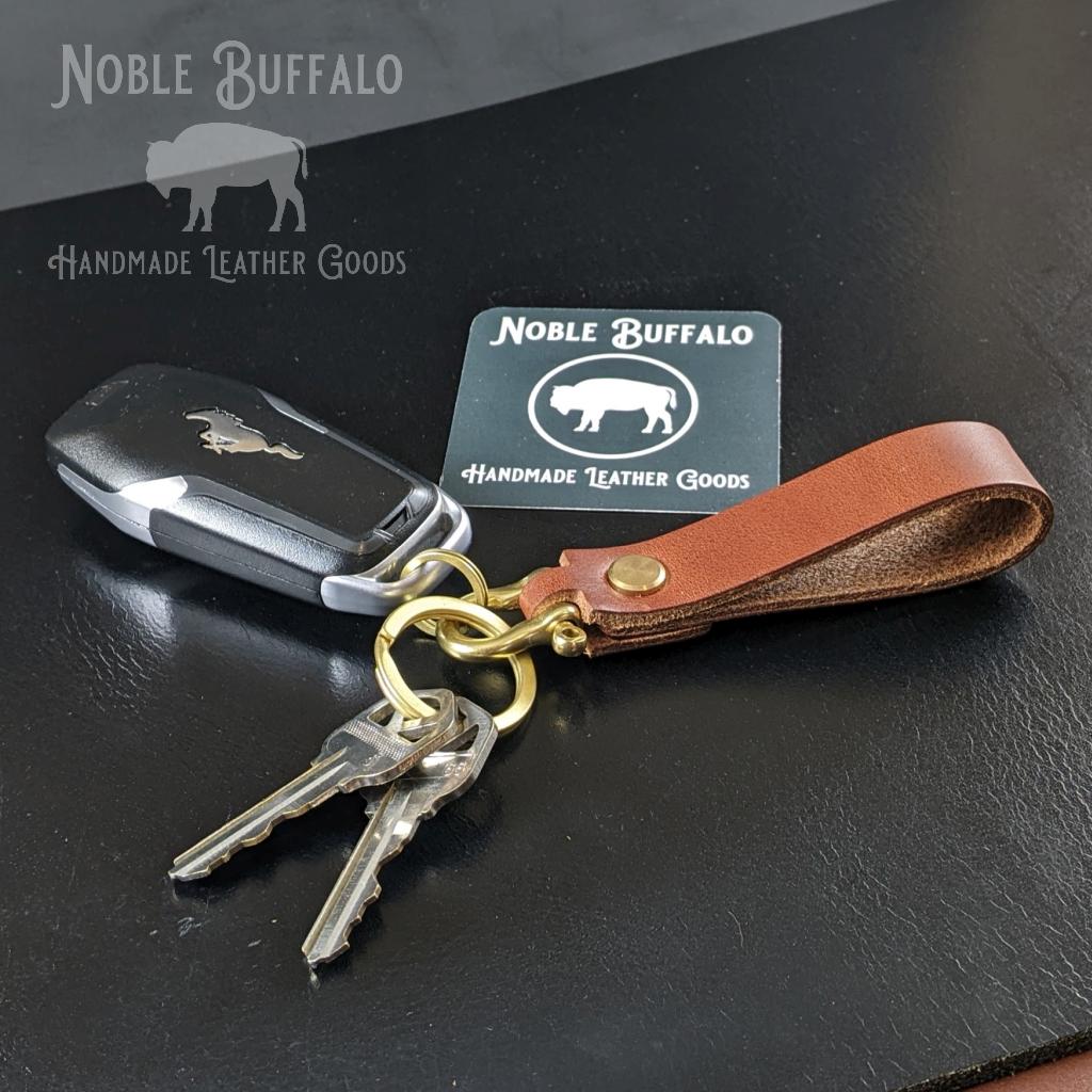This is a hefty leather keychain made from the same thick leather used in the matching belt. Keychain works great on its own or can slide onto your belt. Solid brass hardware looks stunning and is very durable. Fully assembled, you'll receive 1x Brass Shackle, 1x Medium Brass Ring (for house keys), and 1x Small Brass Ring (for bulky car fobs).