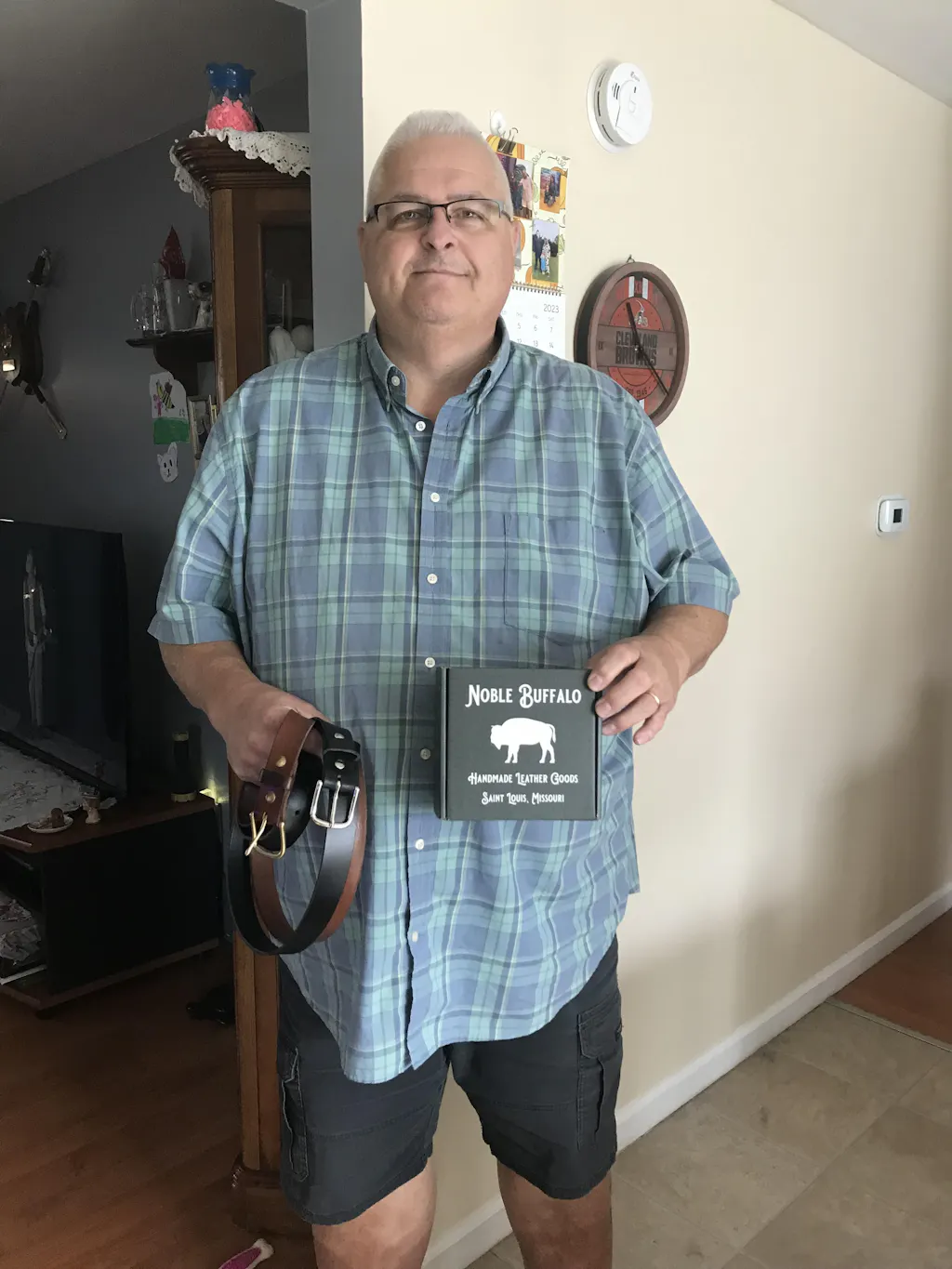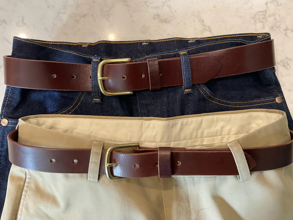 This belt is the bestselling strap in the shop. Buffalo is the softest of the leather straps I offer, which means it will be comfortable to wear, has no break-in period, and has a small amount of flex compared to some of the stiffer bridle leathers. The full grain hide has a beautiful pebbled natural grain. Some hides have more or less features, but all will have more character than a matte-finish belt. Rich color on these straps! Refresh the surface grain over the years with my shop-made leather balm.